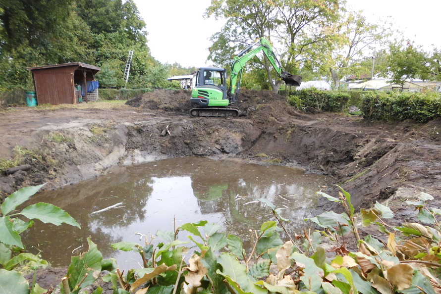 Wir suchten nach Unterstützung und fanden diese dann bei der regionalen Stiftung der Landessparkasse zu Oldenburg! Mit einer großzügigen Zuwendung der LzO-Stiftung konnten wir einen Fachbetrieb des Landschaftsbaus mit dem Teichaushub, dem Abtragen des Oberbodens, der Modellierung einer Wall Fläche und dem Planieren beauftragen. Am 9. September rollten dann die Bagger an. Doch vorab und auch nach den Modellierungsarbeiten war und ist noch viel Handarbeit zu erledigen. Armin und Rolf sind weiterhin unermüdlich dabei, die Gestaltung des Teichs und seiner Uferbereiche voranzubringen. Es ist eine Mammutaufgabe, die insbesondere die beiden da bewältigen! Ein großer Dank an die regionale Stiftung der Landessparkasse zu Oldenburg für ihre Unterstützung und ebenso an Armin und Rolf, die beide unermüdlich an der Biotopgestaltung arbeiten!